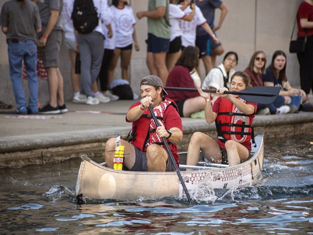 A team works in sync while racing in the Regatta canoe competition on the Downtown Canal.