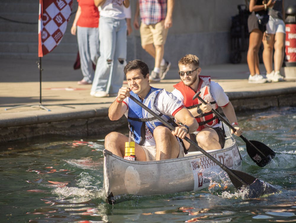 A pair of paddlers dig in as they round a turn during the Regatta canoe race.