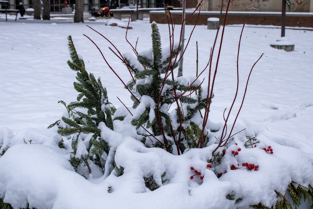 Evergreen branches and bright red berries peek through the snow in a campus planter.