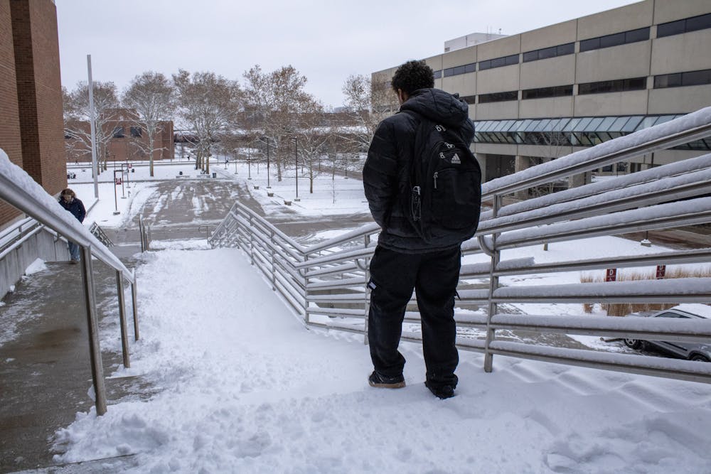A student walks down the steps, looking out over a snow-covered walkway on campus.