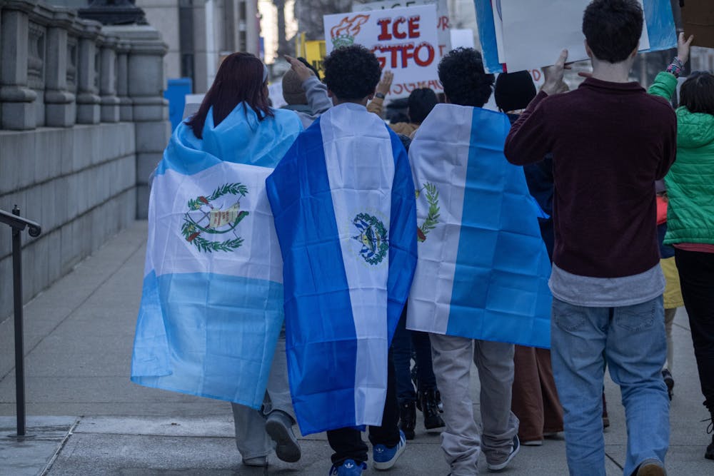 Three marchers walk side by side hold the flags of Guatemala and El Salvador on their backs.