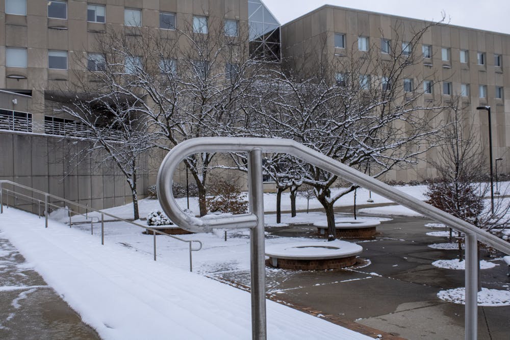 A snow-dusted handrail frames the courtyard, where bare winter trees stand against the cold morning light.