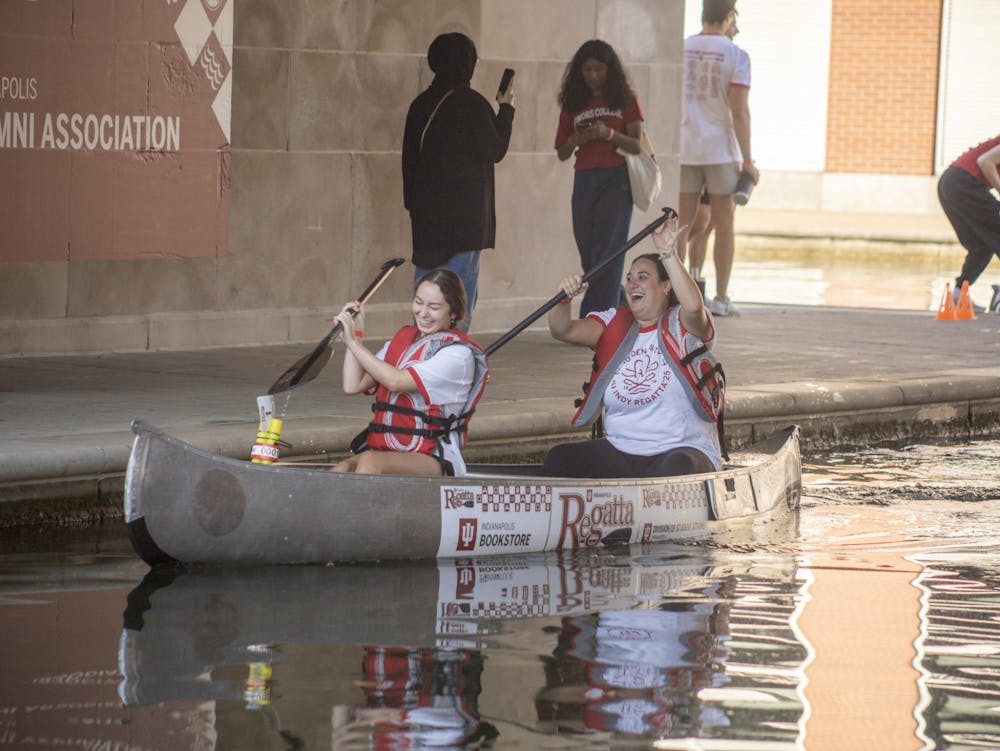 Two participants paddle under the New York Street bridge during the Regatta canoe race on the Downtown Canal in Indianapolis.